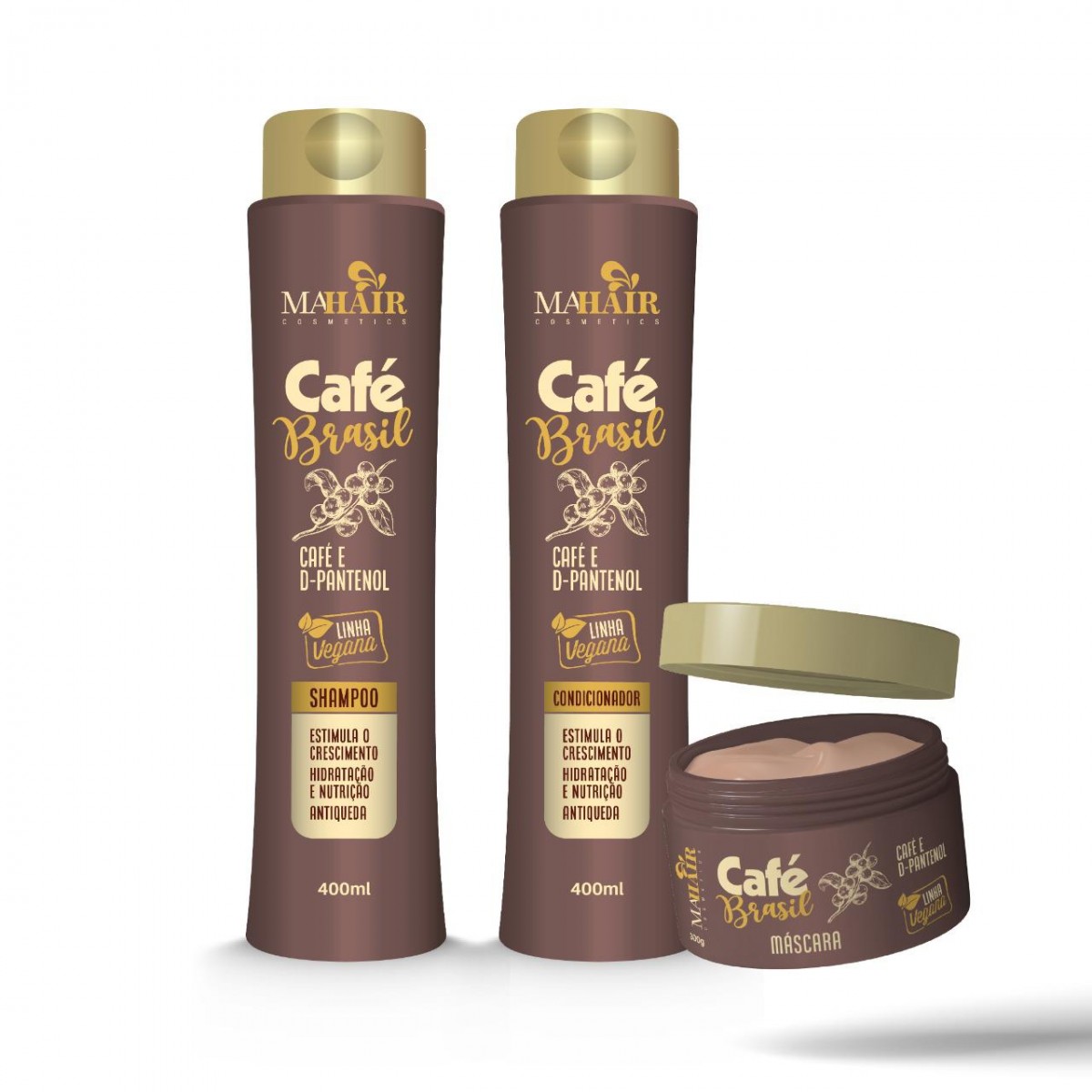 A linha Café Brasil Mahair foi especialmente desenvolvida para estimular o crescimento, hidratar os fios e auxiliar na prevenção da queda. O Café contém alta concentração de cafeína que ajuda a prevenir a perda de cabelo, além de melhorar a textura capilar, fortalecendo os fios de dentro para fora, o D-Pantenol é a conhecida Pró-Vitamina B5 essencial para saúde e maciez dos fios.