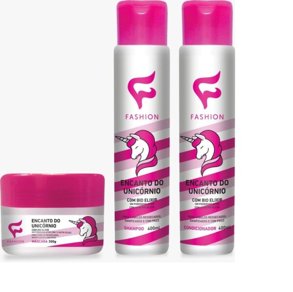 A linha Encanto do Unicórnio Fashion possui formulação enriquecida com Bio Elixir, um poderoso ativo formado por 12 Nutri-óleos especialmente selecionados para proporcionar brilho intenso, sedosidade, maciez extrema e efeito anti frizz. Você ficará encantado com o resultado! Um tratamento completo para obter o seu cabelo dos sonhos, perfeitamente alinhado e saudável.